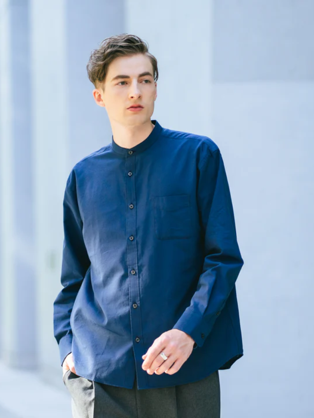 JE44👖[BLUE STANDARD] 法國亞麻混紡寬鬆立領襯衫