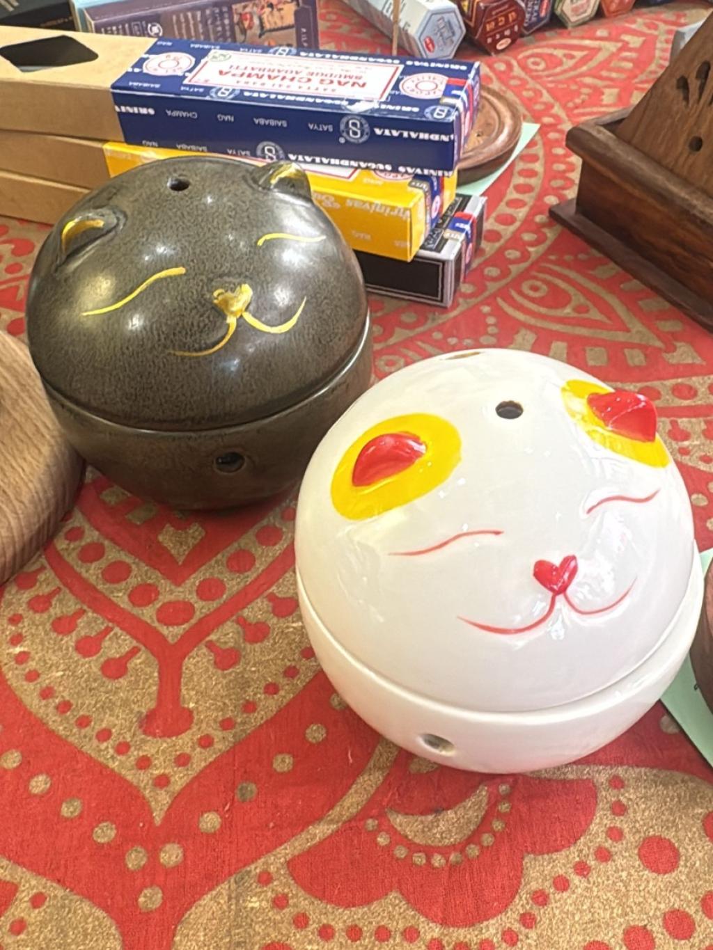 兩用設計:貓咪頭部可以打開,底座通常設有插孔與平放空間,同時支援 塔香 (Cone) 與 線香 (Stick)。