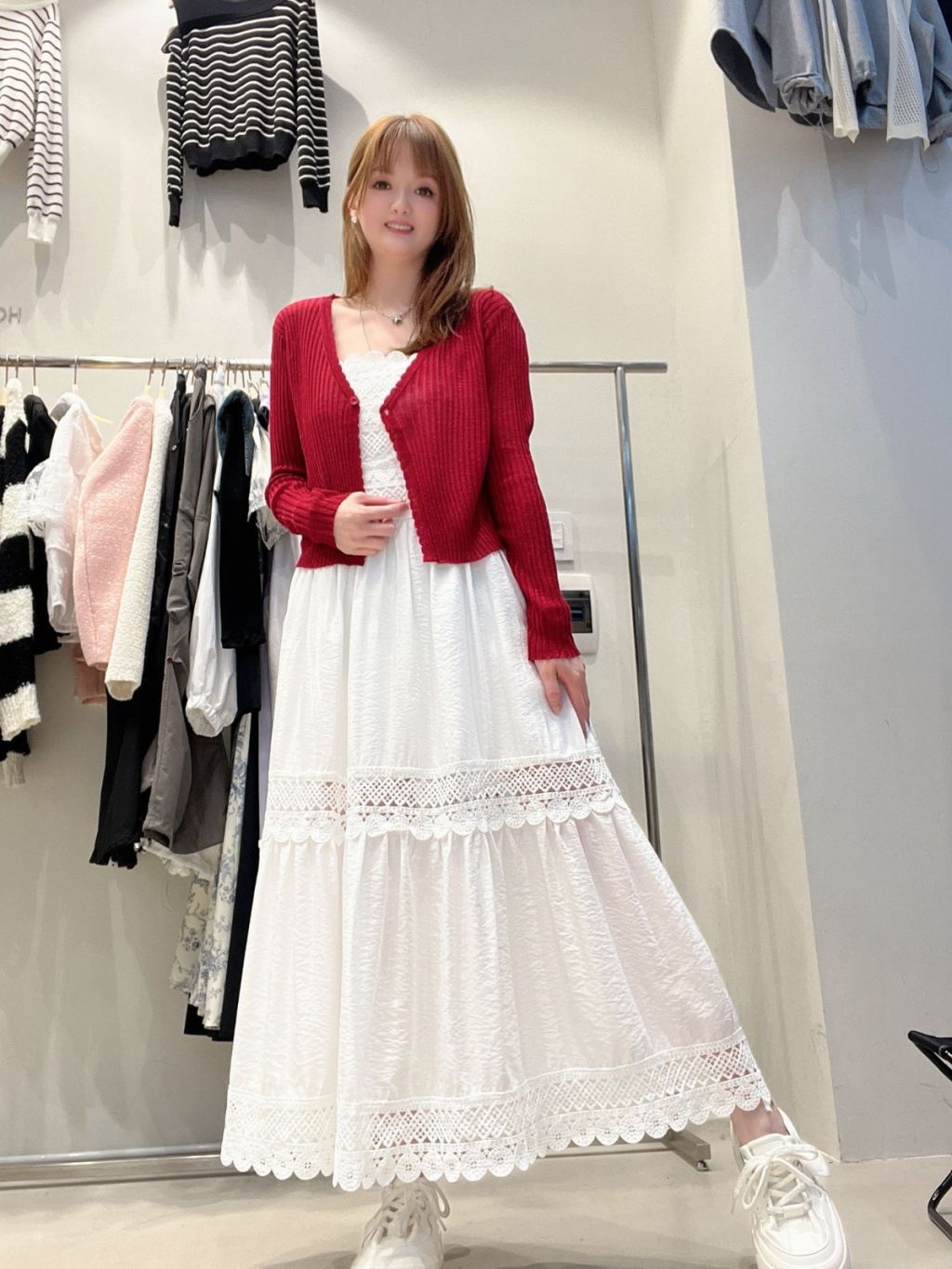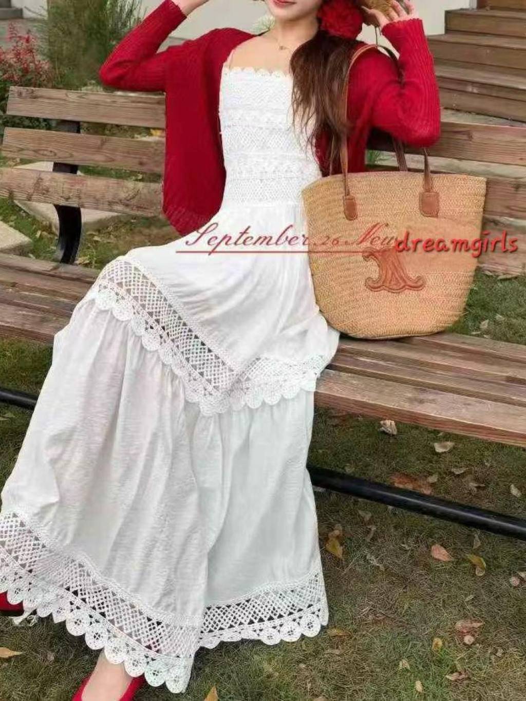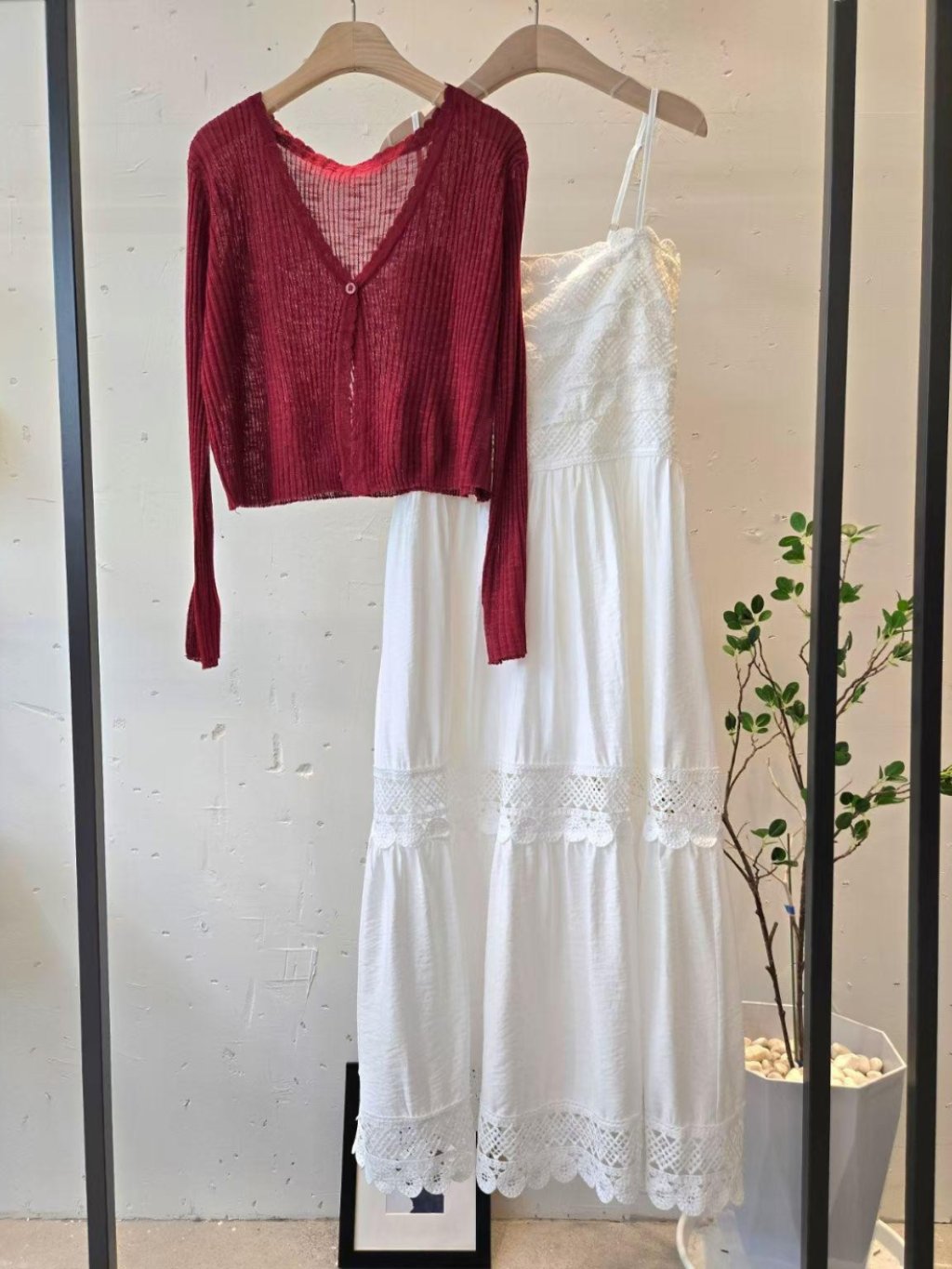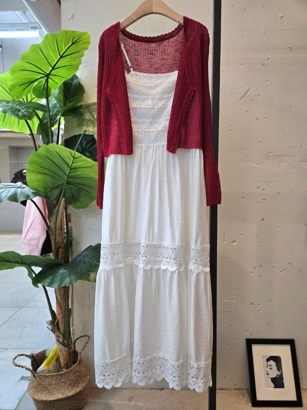 HP2 文藝紅色開衫+白色蕾絲無袖連身裙