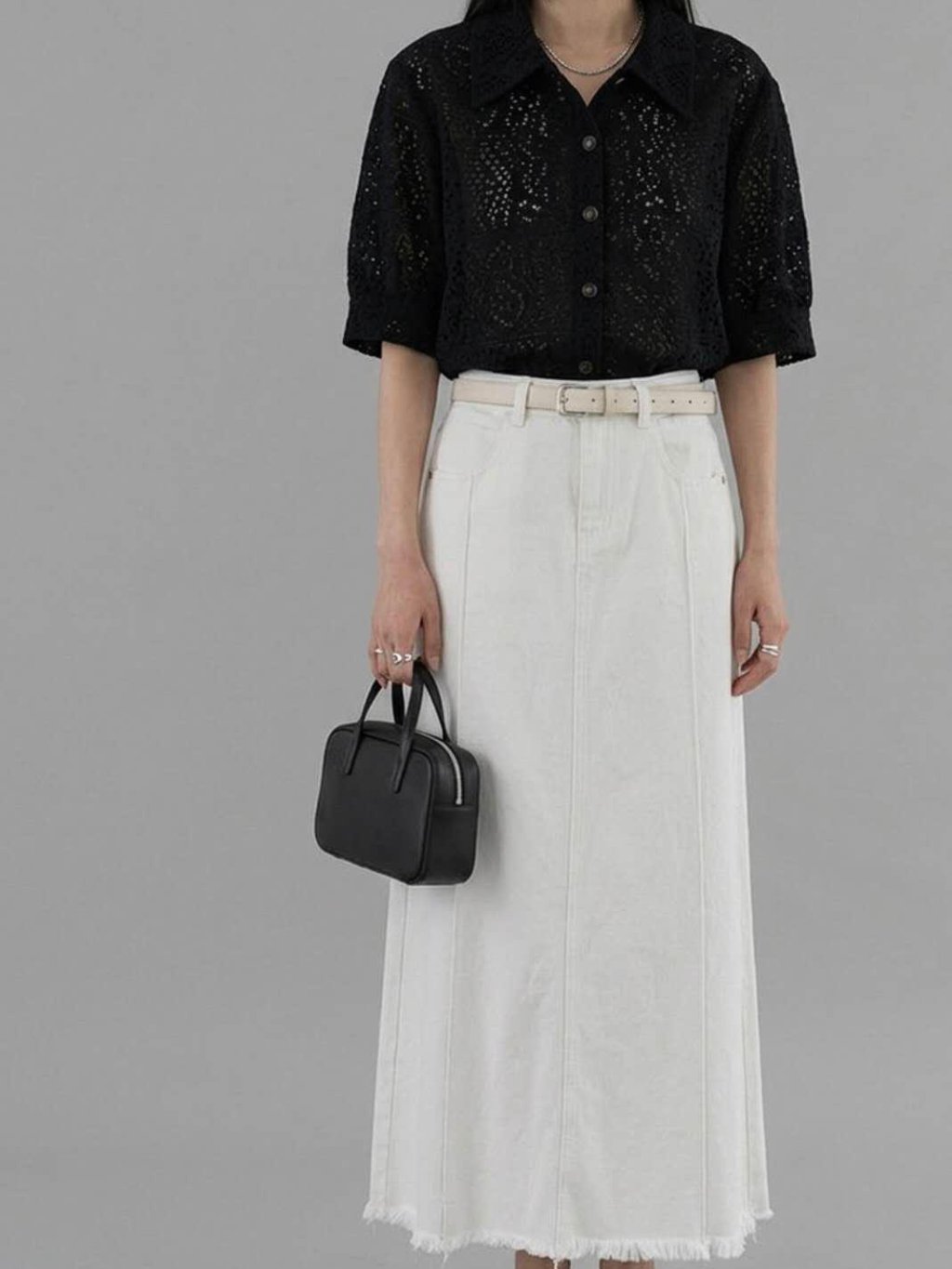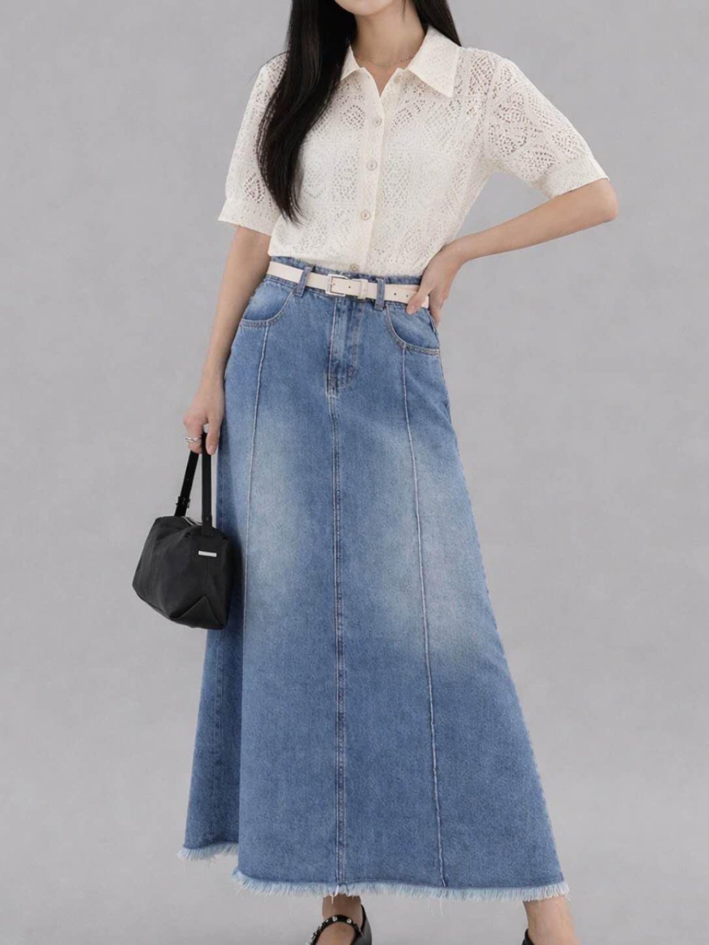 主頁 CO1 下擺抽鬚設計感 A 字丹寧裙