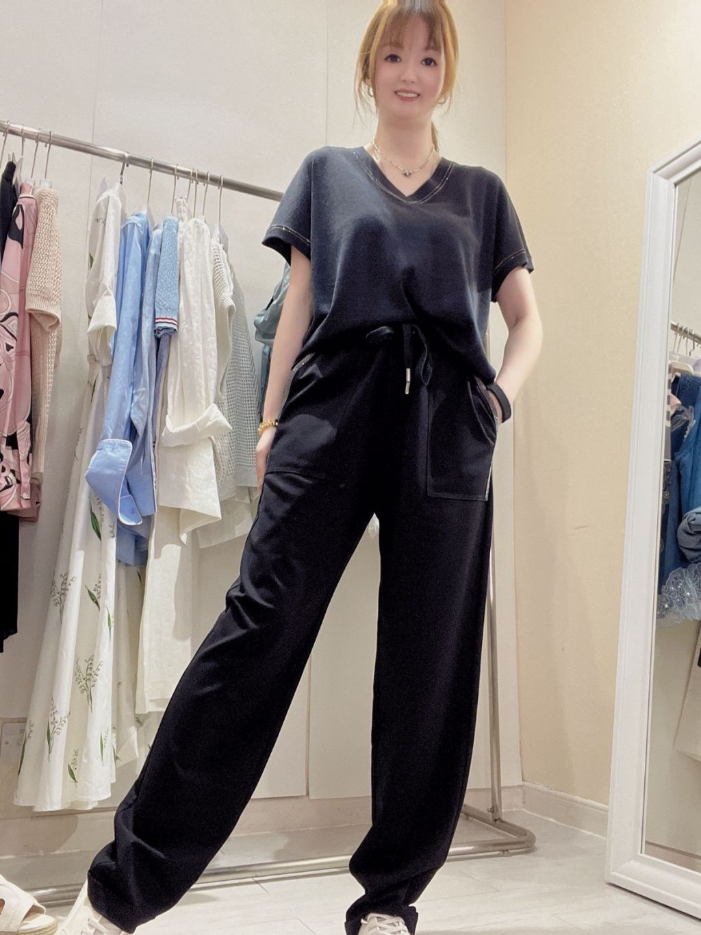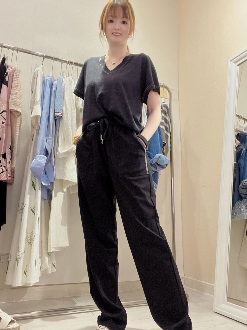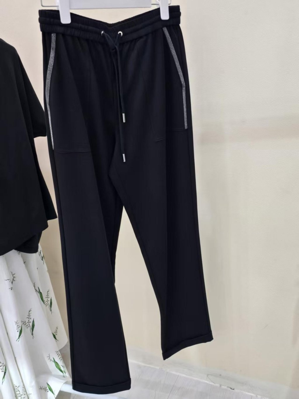 CM28 黑色珠帶側袋邊長褲
