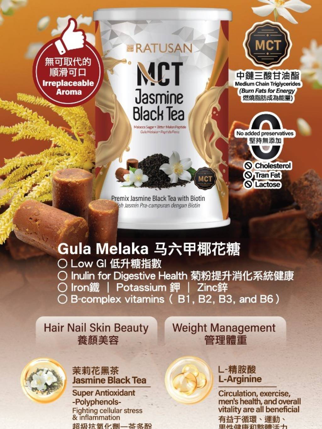 "主要成分:MCT油、馬六甲椰糖、茉莉花茶、L-賴氨酸、精氨酸、生物素(維生素 B7)